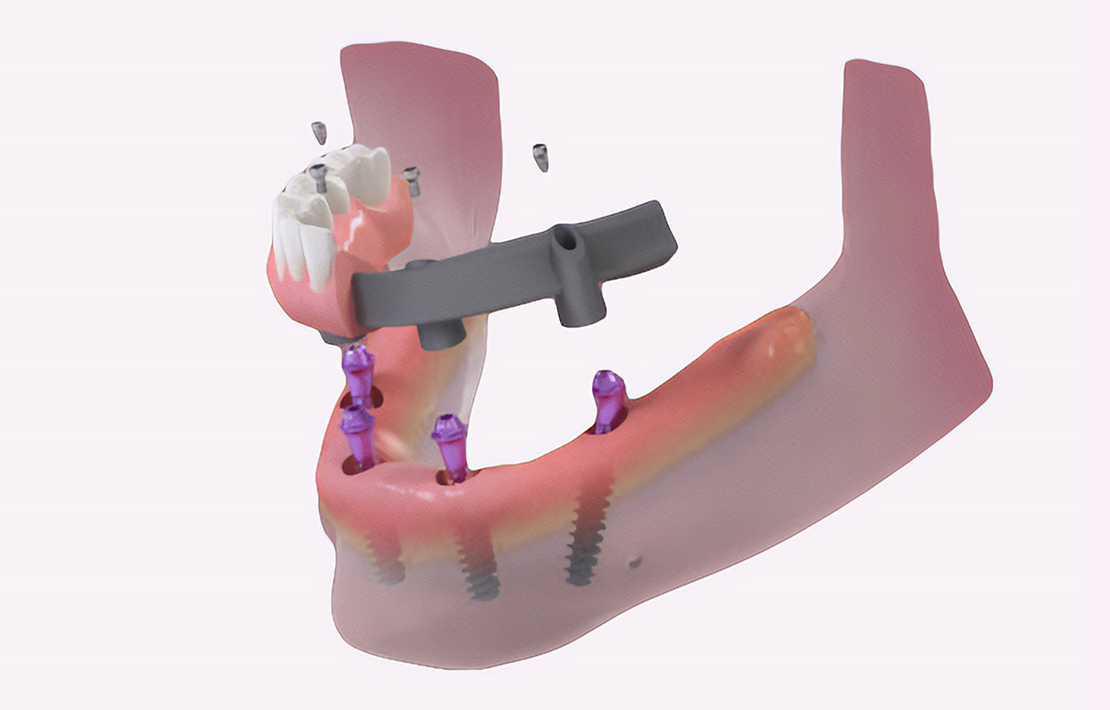 Both techniques involve a fixed bridge with artificial teeth and a pink base that mimics the gums. The prosthesis is crafted in a continuous “horseshoe” shape that replaces not only the teeth but also the lost volume of gums and bone—hence the pink component, which is thicker than natural gums. This monolithic design provides what’s known as “cross-arch stability”—a strong connection of all implants through a single framework, which is critical for the long-term success of the method. Unlike removable dentures, the patient does not need to take the bridge out—it is permanently screwed onto the implants.